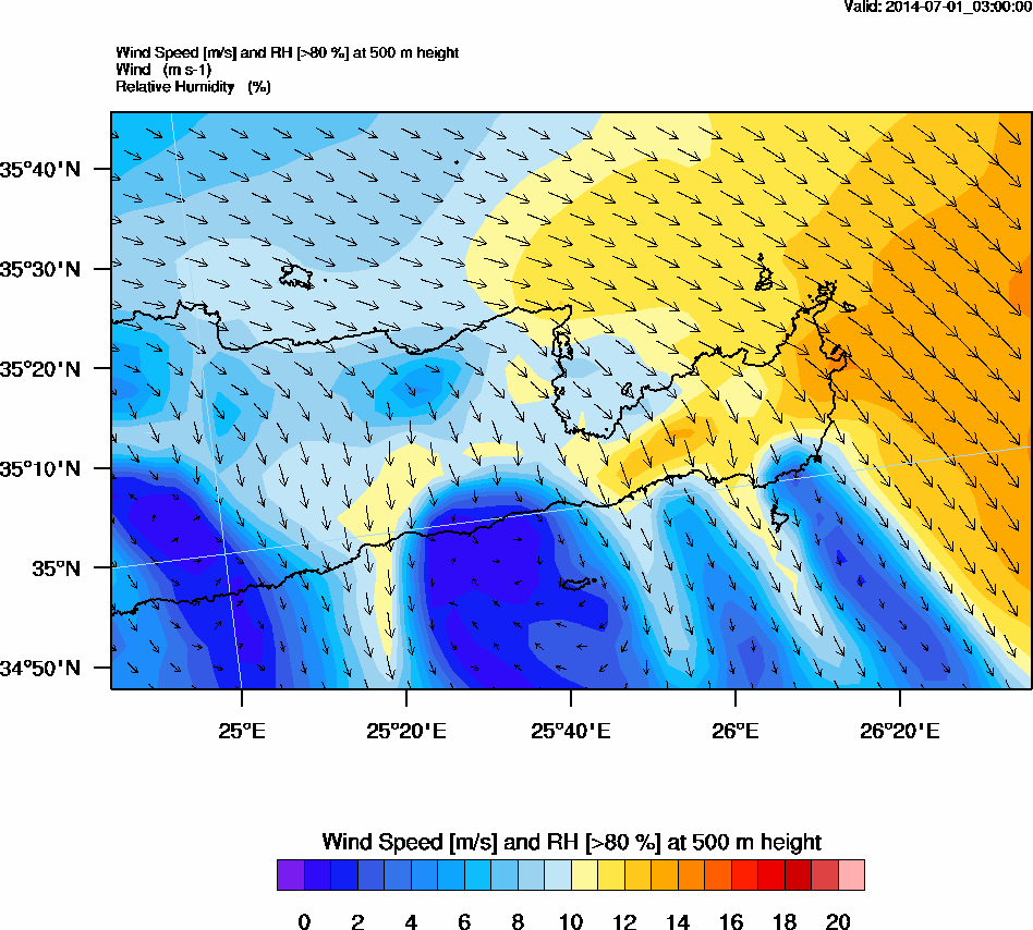 Graph 2: arw002.png - Wind Speed [m/s] and RH [>80%] at 500 m height