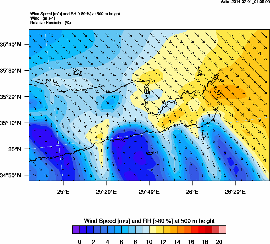 Graph 2: arw007.png - Wind Speed [m/s] and RH [>80%] at 500 m height