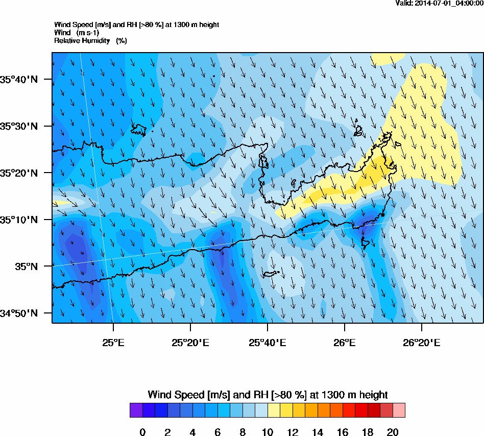 Graph 4: arw009.png - Wind Speed [m/s] and RH [>80%] at 1300 m height