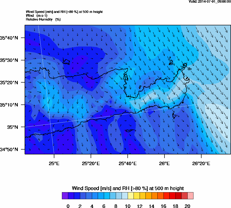 Graph 2: arw032.png - Wind Speed [m/s] and RH [>80%] at 500 m height