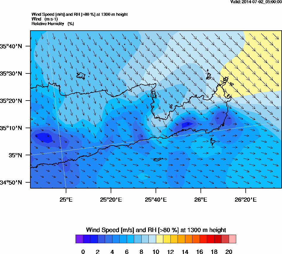 Graph 4: arw014.png - Wind Speed [m/s] and RH [>80%] at 1300 m height