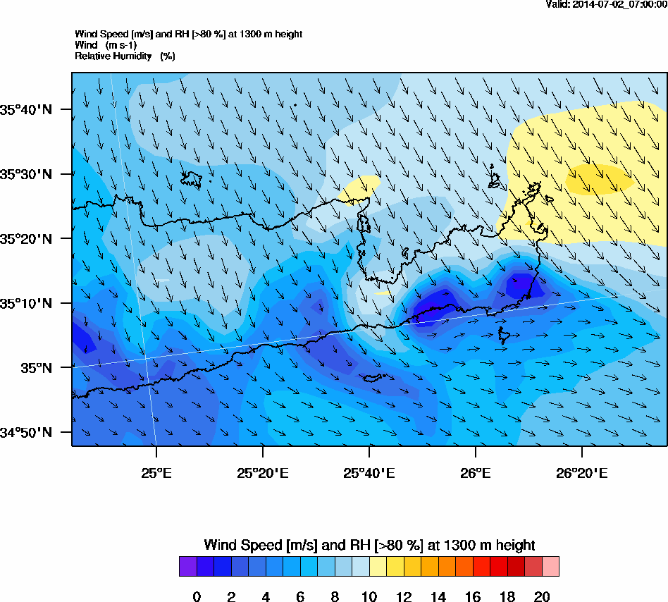 Graph 4: arw024.png - Wind Speed [m/s] and RH [>80%] at 1300 m height