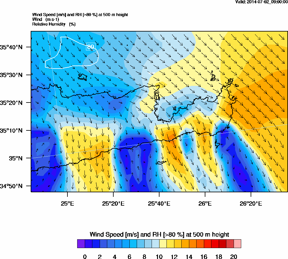 Graph 2: arw032.png - Wind Speed [m/s] and RH [>80%] at 500 m height