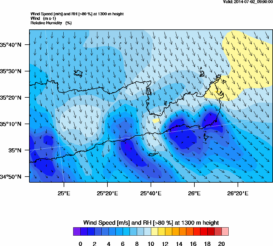 Graph 4: arw034.png - Wind Speed [m/s] and RH [>80%] at 1300 m height