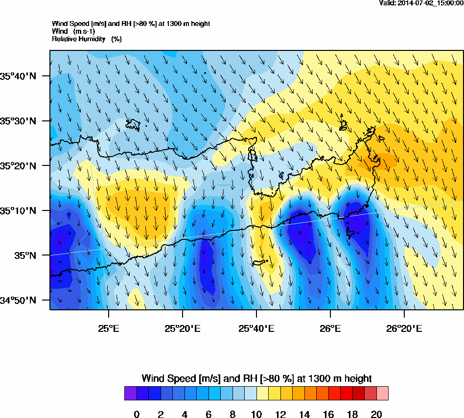 Graph 4: arw064.png - Wind Speed [m/s] and RH [>80%] at 1300 m height