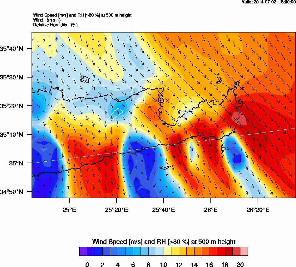Graph 2: arw067.png - Wind Speed [m/s] and RH [>80%] at 500 m height