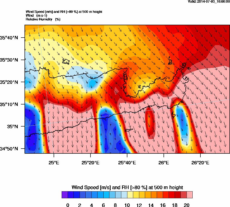 Graph 2: arw067.png - Wind Speed [m/s] and RH [>80%] at 500 m height