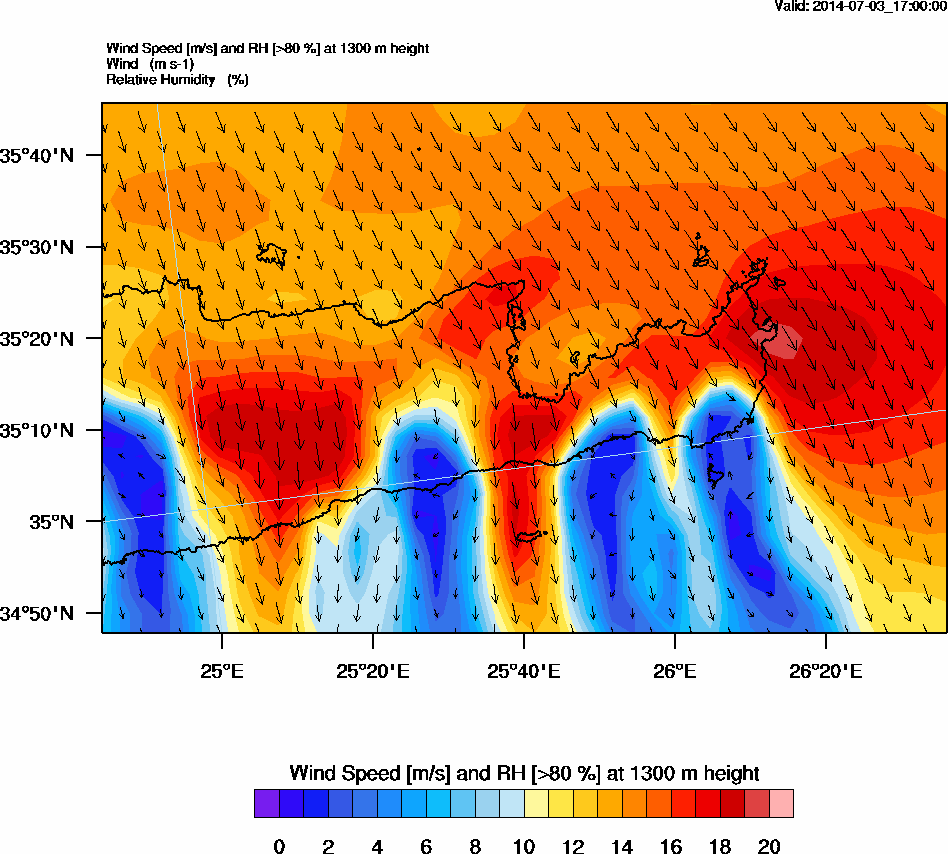 Graph 4: arw074.png - Wind Speed [m/s] and RH [>80%] at 1300 m height