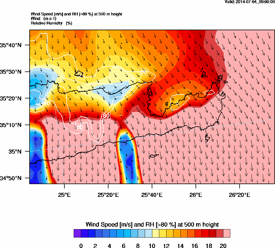 Graph 2: arw032.png - Wind Speed [m/s] and RH [>80%] at 500 m height
