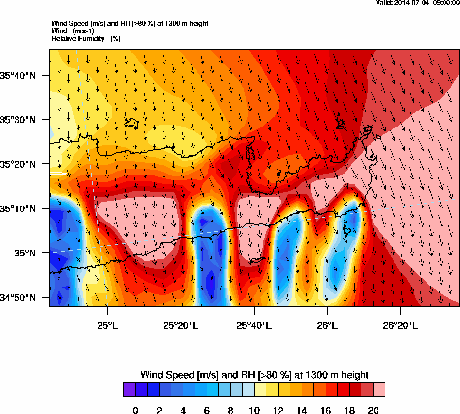 Graph 4: arw034.png - Wind Speed [m/s] and RH [>80%] at 1300 m height