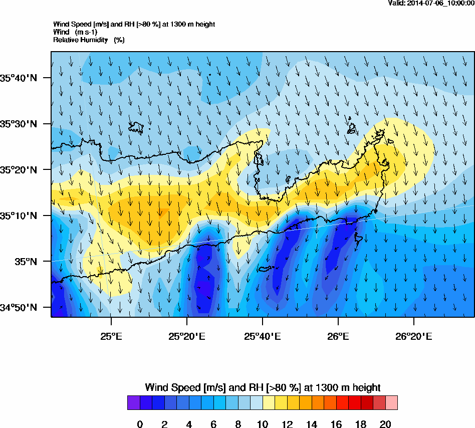 Graph 4: arw039.png - Wind Speed [m/s] and RH [>80%] at 1300 m height