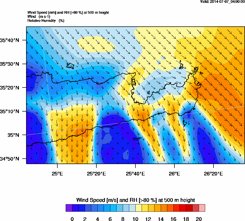 Graph 2: arw007.png - Wind Speed [m/s] and RH [>80%] at 500 m height